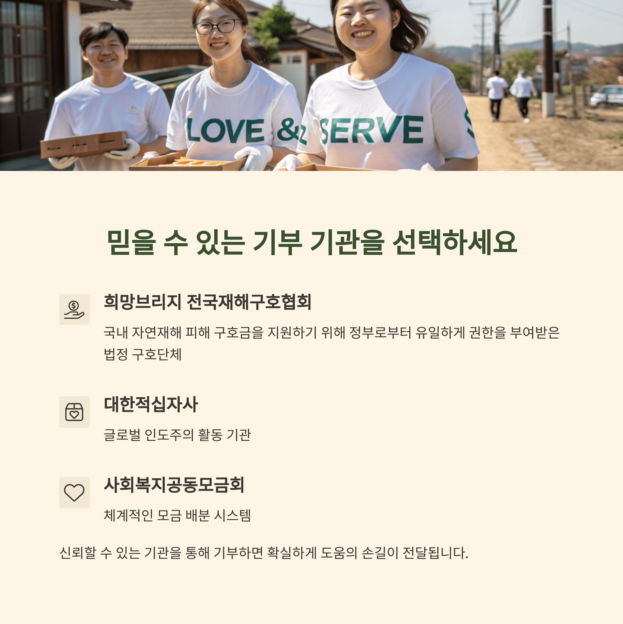 | 기부처 확인 | 신뢰 가능한 기관을 통해 안전하게 참여 |