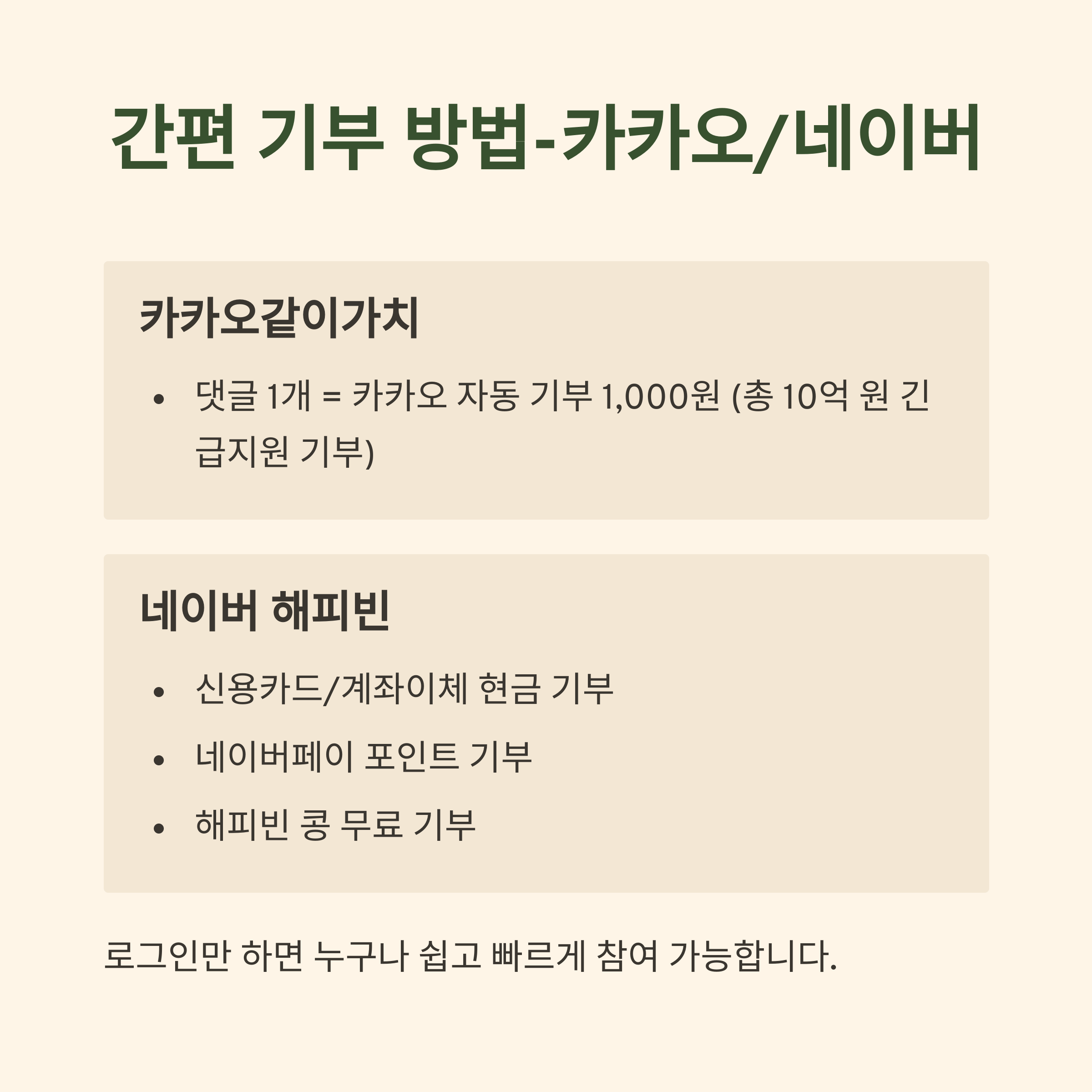 | 희망브리지, 적십자사, 각 지자체 | 최대 33%까지 공제 가능 | 카카오같이가치, 네이버 해피빈 |