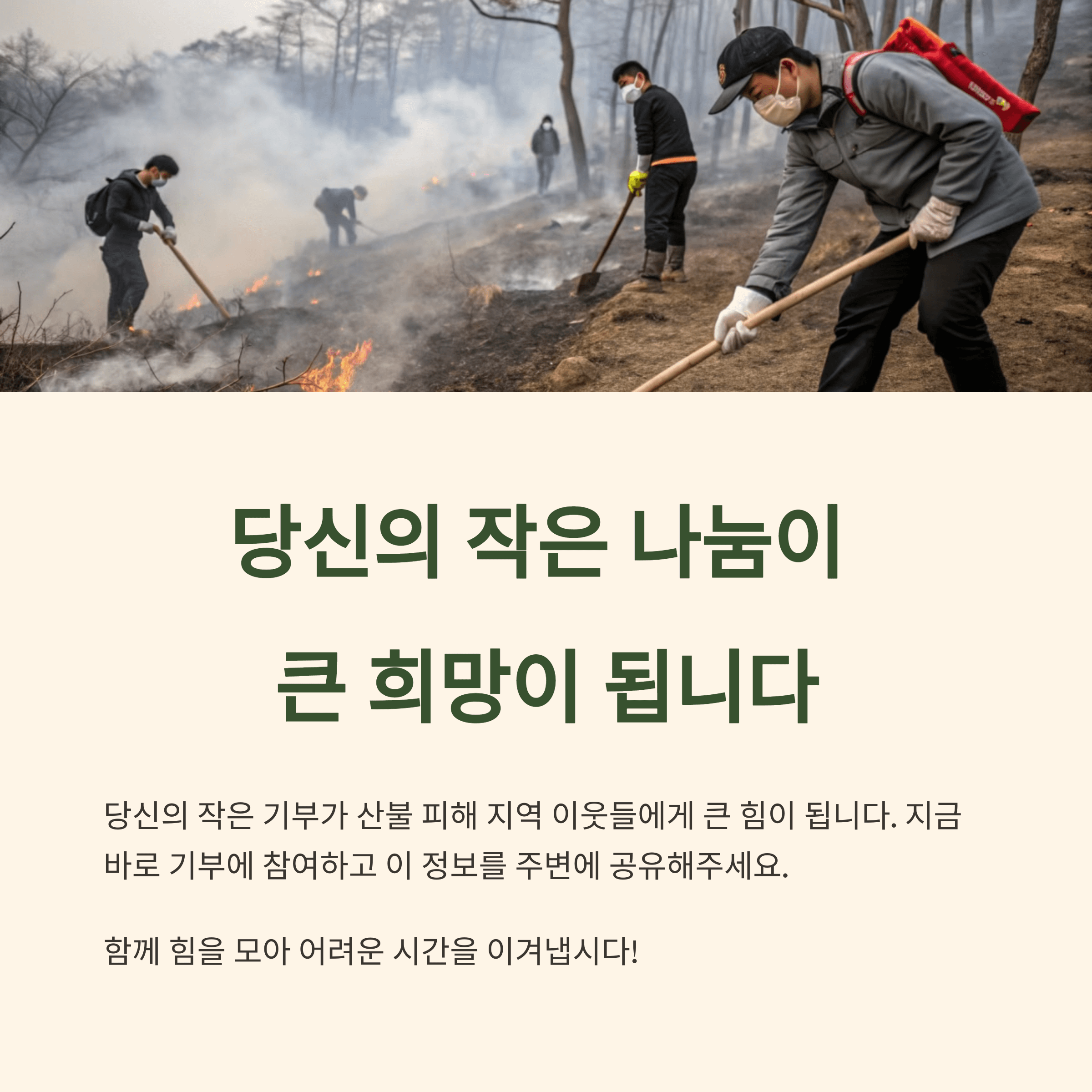 산불 피해 복구는 더 많은 이들의 관심과 참여로 완성됩니다. 작지만 따뜻한 기부의 실천이 모이면, 무너진 삶의 터전도 다시 일어설 수 있습니다. 지금 바로 신뢰할 수 있는 경로를 통해 산불 피해 성금에 동참해 주세요. 작은 행동이 큰 희망이 됩니다.