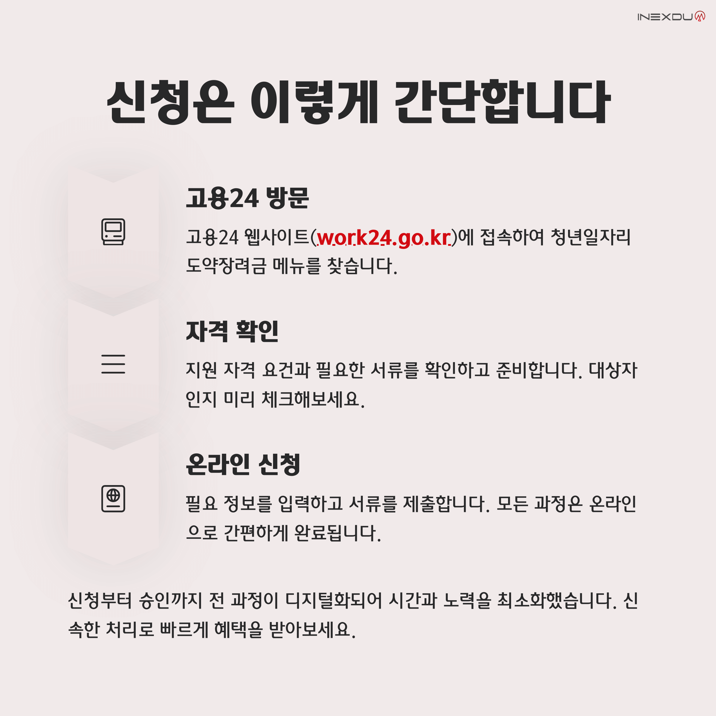 | 만 15세~34세 청년, 우선지원 기업 대상 | 고용24 누리집 통해 온라인 신청 | 허위 내용 기재 시 지원금 회수 |